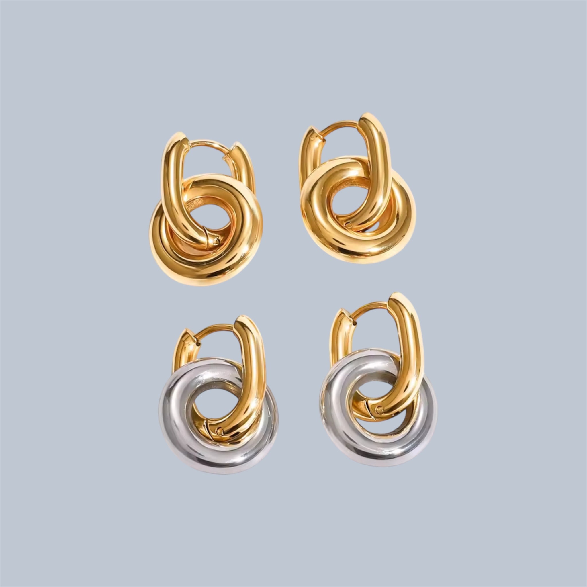Aros entrelazados con acabado brillante, disponibles en dorado o en mix dorado y plateado.