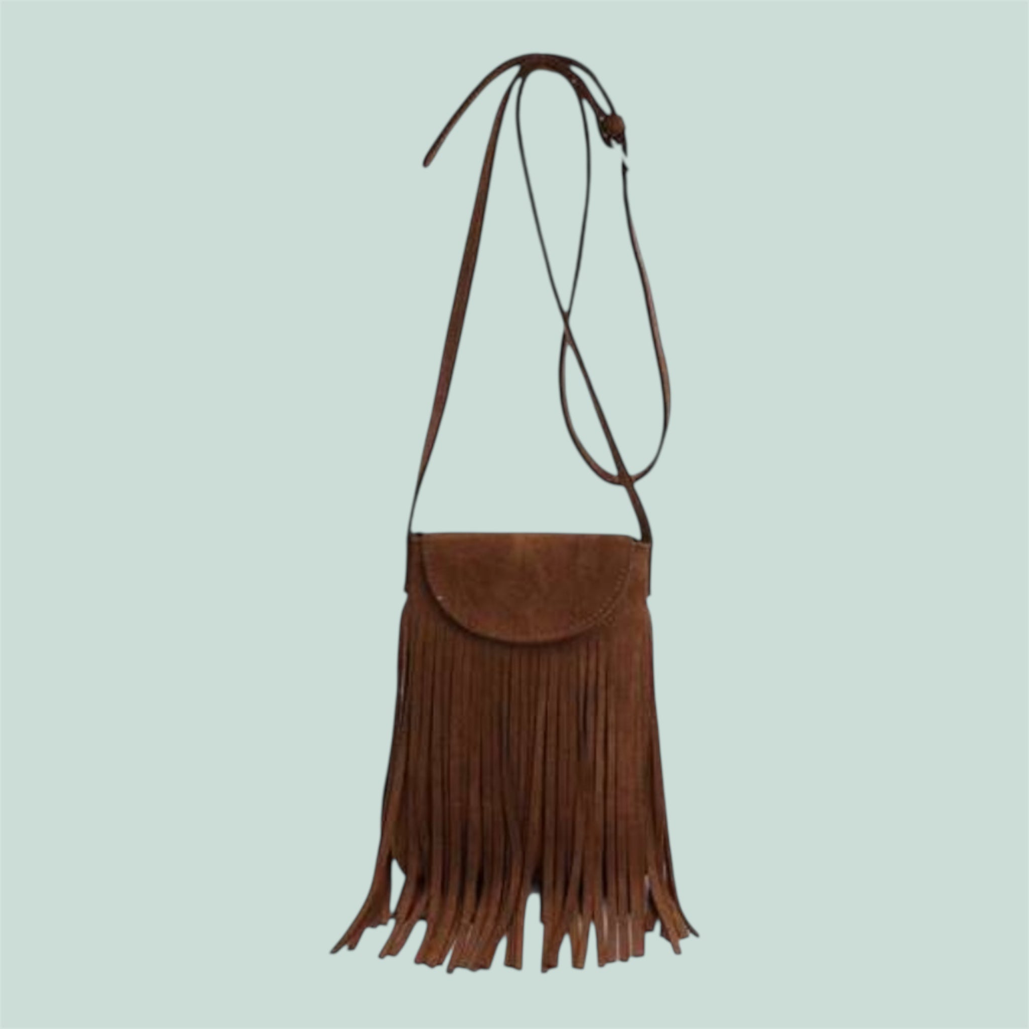 Bolso pequeño tipo bandolera confeccionado en material efecto ante. Diseño con solapa y detalle de flecos largos en la parte frontal. Asa larga regulable para llevar al hombro o cruzado. Interior compacto ideal para llevar lo esencial (móvil, llaves, labial).