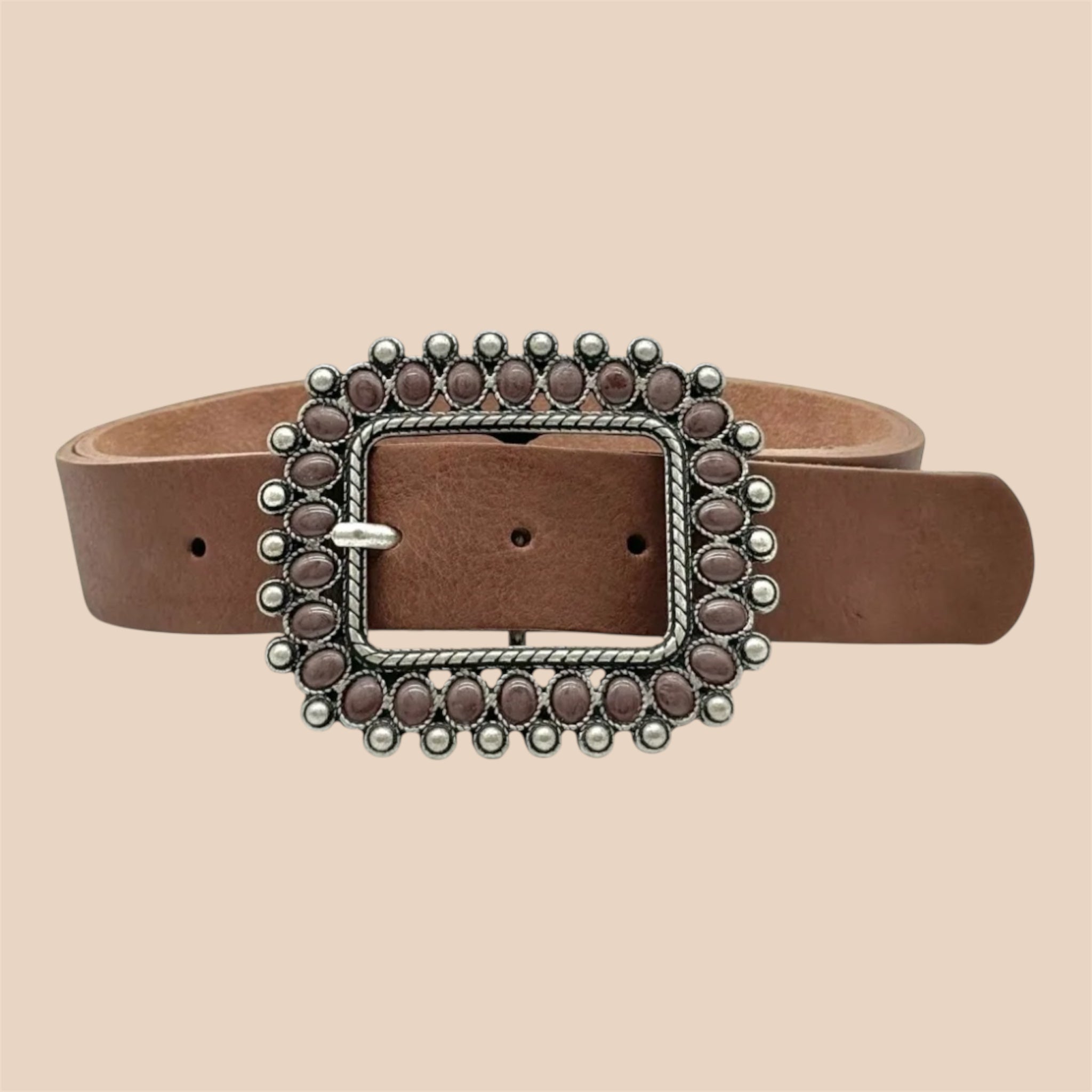 Cinturón de piel auténtica (90–95 cm) con hebilla ovalada adornada con tachuelas metálicas. Disponible en varios tonos,...