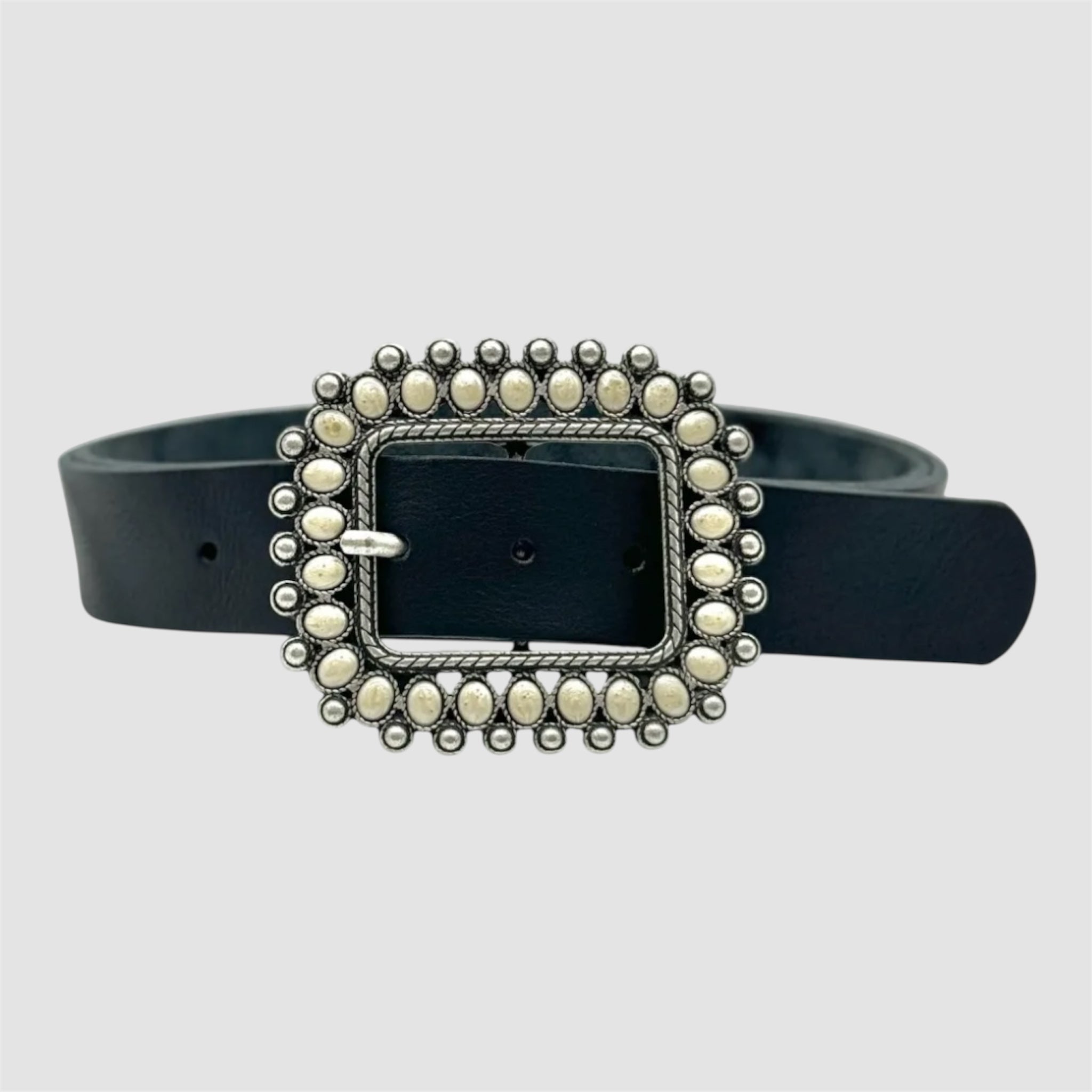 Cinturón de piel auténtica (90–95 cm) con hebilla ovalada adornada con tachuelas metálicas. Disponible en varios tonos,...