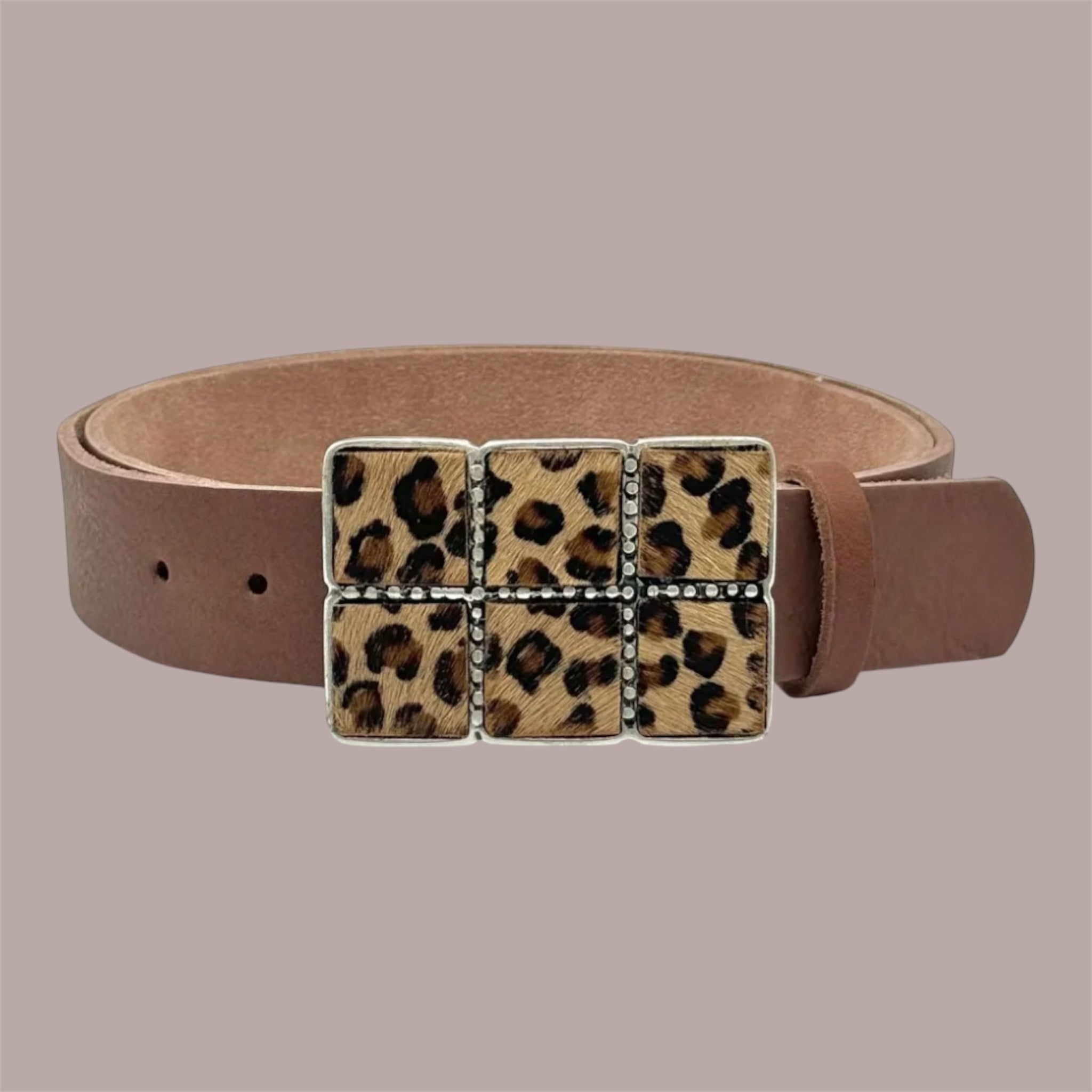Dale un giro salvaje y sofisticado a tus looks con este cinturón de piel marrón con hebilla de cuadros en estampado animal print. Su diseño combina carácter y versatilidad: lo puedes llevar con vaqueros, vestidos o pantalones de tiro alto para marcar cintura y elevar cualquier outfit.