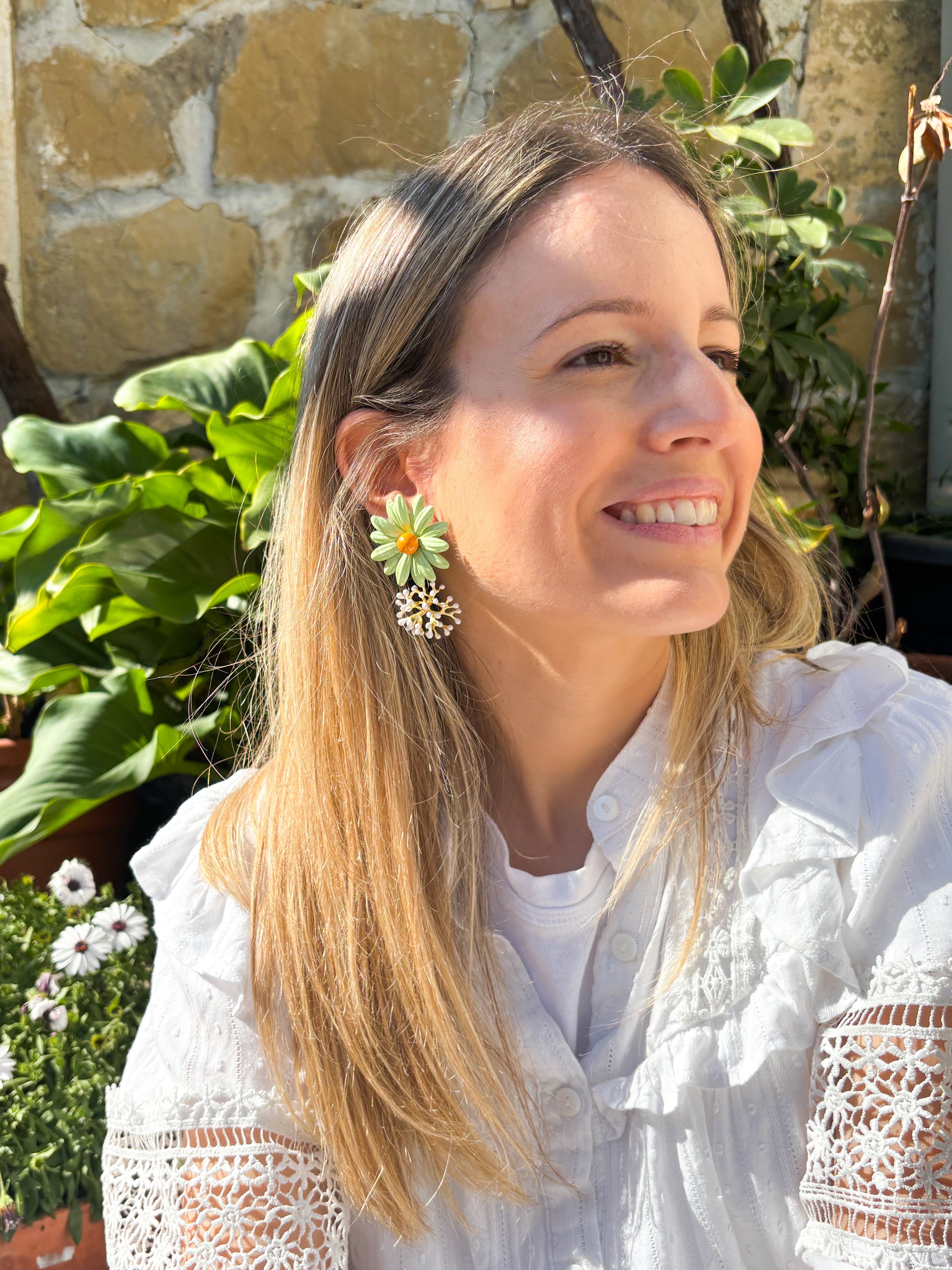 La flor, sellada en resina con un acabado brillante y luminoso, se combina con una pieza inferior inspirada en formas de alga y coral, realizada en bronce con baño de oro. El contraste entre el color vibrante y el dorado crea un efecto súper favorecedor: llamativo, elegante y con un punto artesanal muy especial.