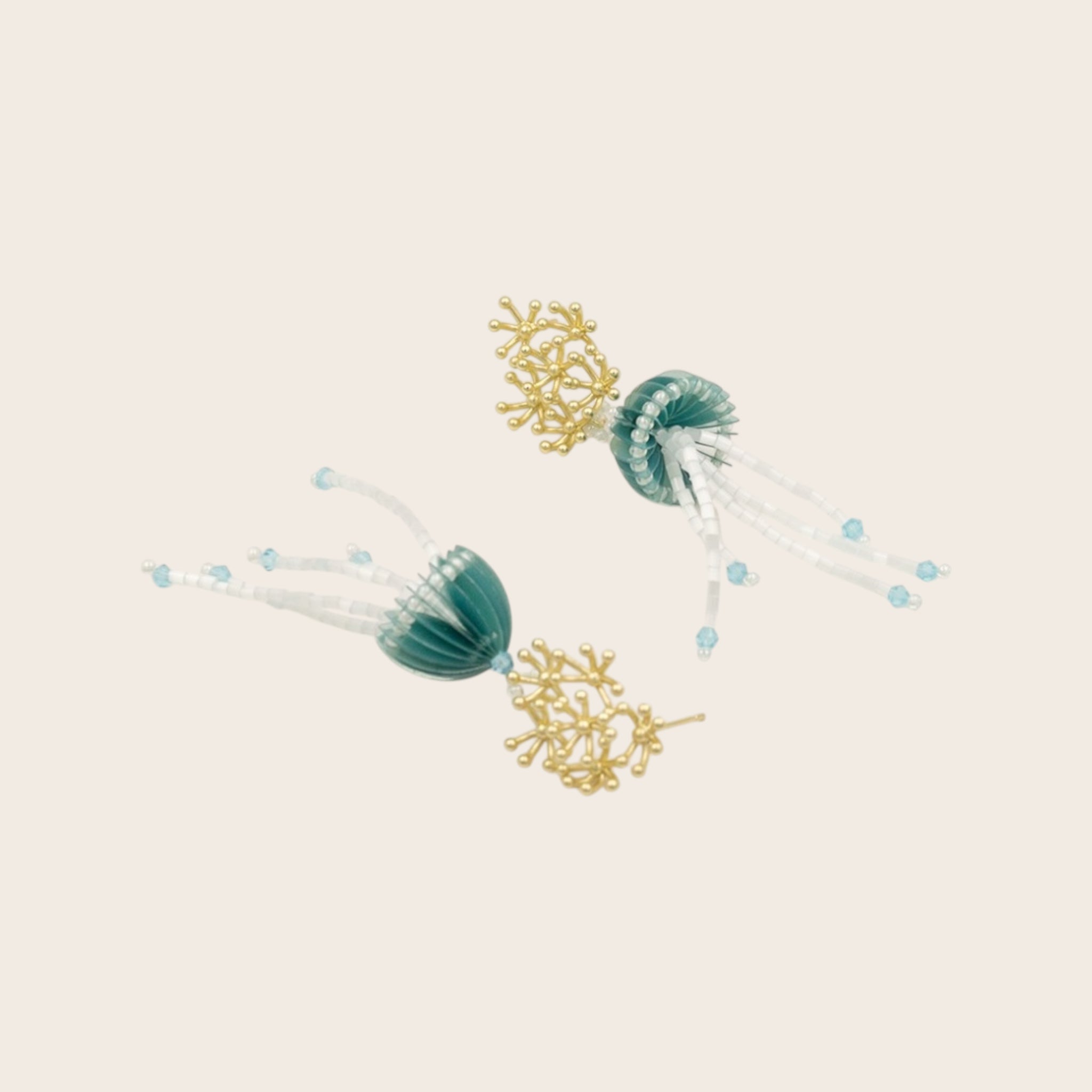 Pendientes bañados en oro, hechos a mano. Su diseño combina una textura orgánica inspirada en el coral con una caída ligera de cuentas que recuerda al movimiento del mar.