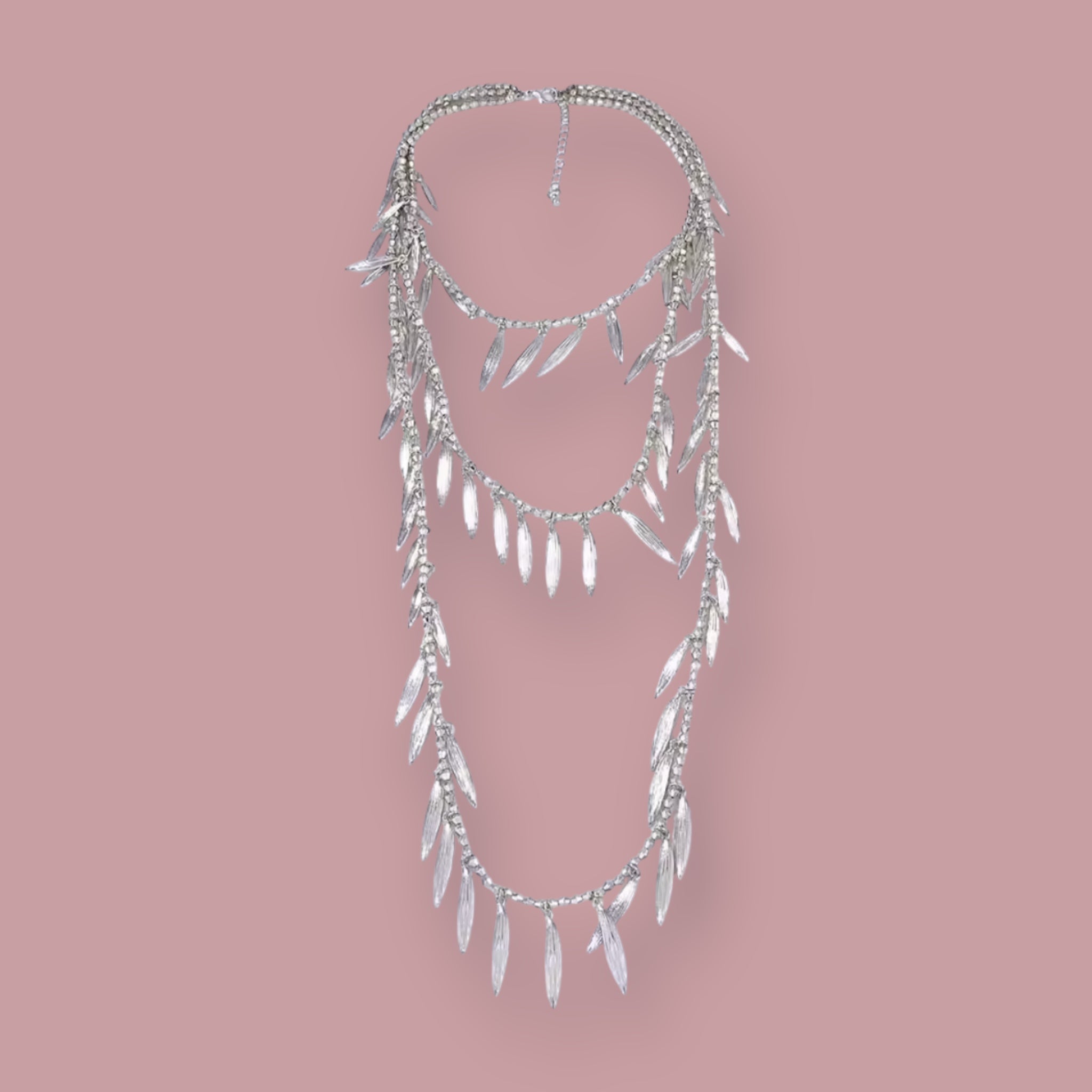 Elegante y con movimiento, el Collar Cascada Plata está formado por tres hileras adornadas con charms en forma de hoja que caen como una lluvia brillante. Su diseño en capas lo convierte en la pieza ideal para dar un toque sofisticado y lleno de luz a cualquier look, desde un vestido de noche hasta un conjunto casual chic.