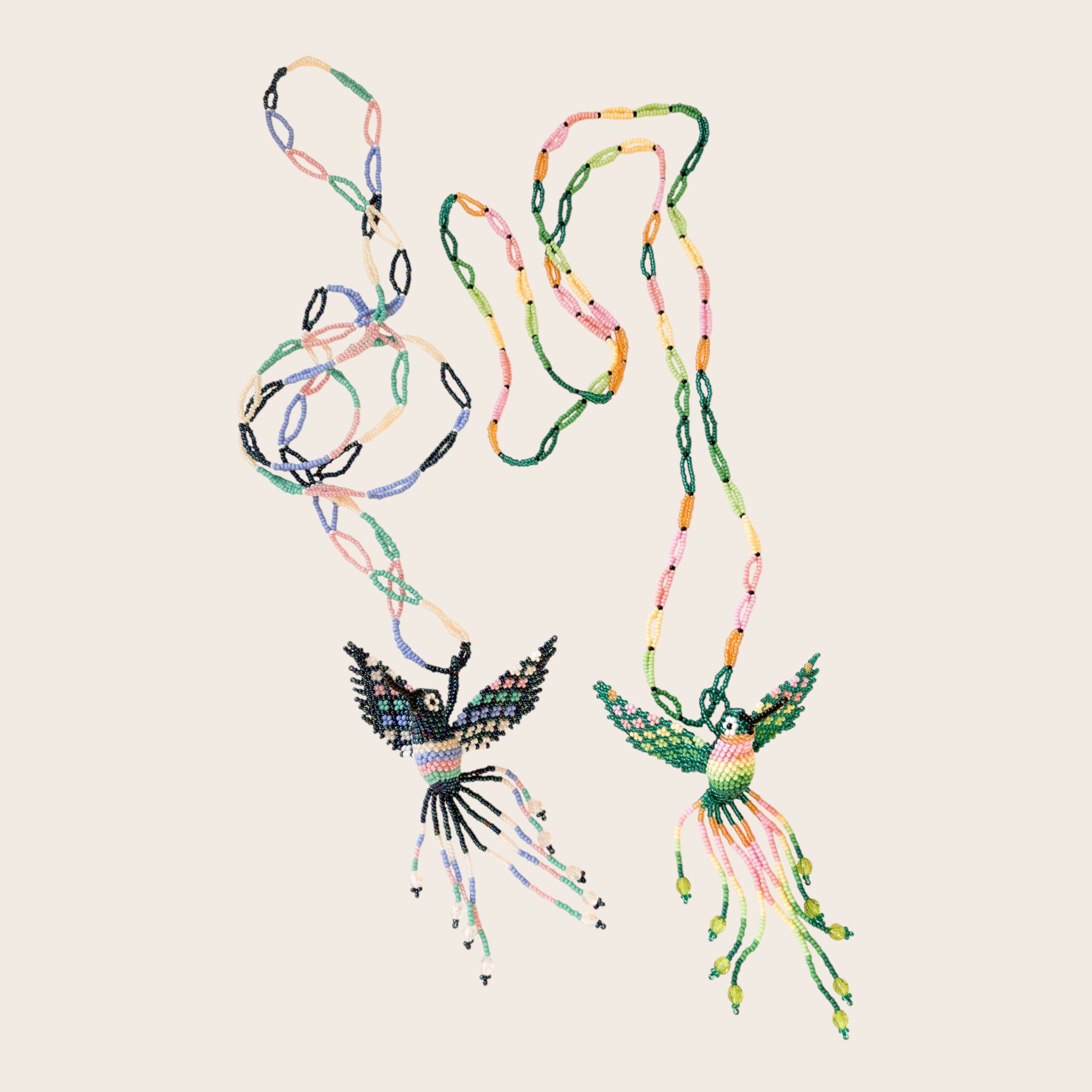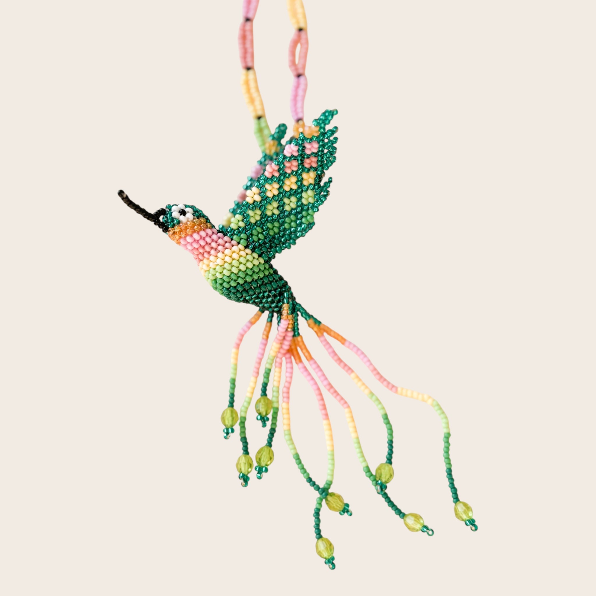 El protagonista es un colibrí tejido cuenta a cuenta, elaborado a mano con pequeñas cuentas de colores que aportan textura, brillo y movimiento. La cadena, también realizada con abalorios, completa la pieza con un aire alegre y tropical.
