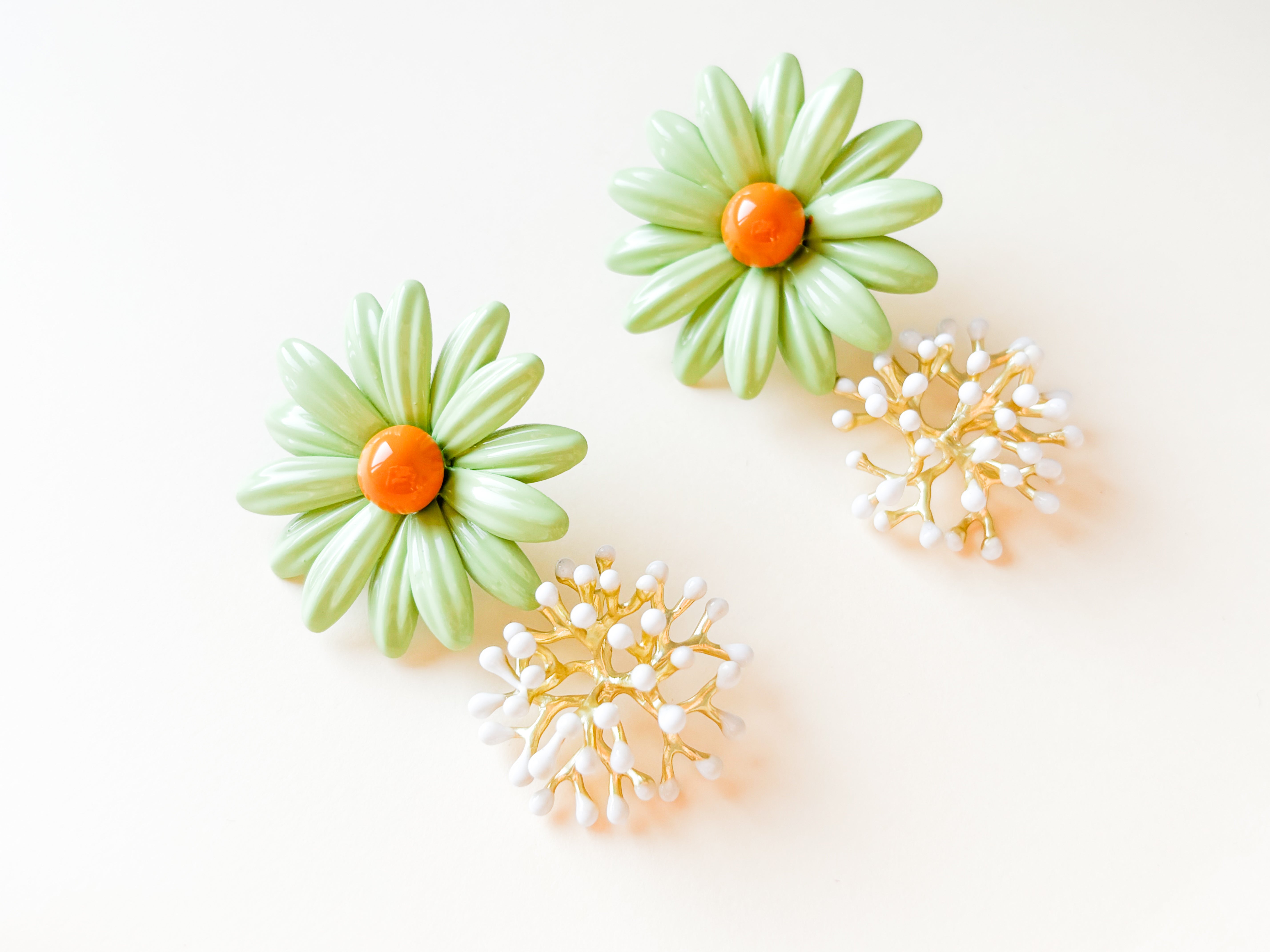 La flor, sellada en resina con un acabado brillante y luminoso, se combina con una pieza inferior inspirada en formas de alga y coral, realizada en bronce con baño de oro. El contraste entre el color vibrante y el dorado crea un efecto súper favorecedor: llamativo, elegante y con un punto artesanal muy especial.