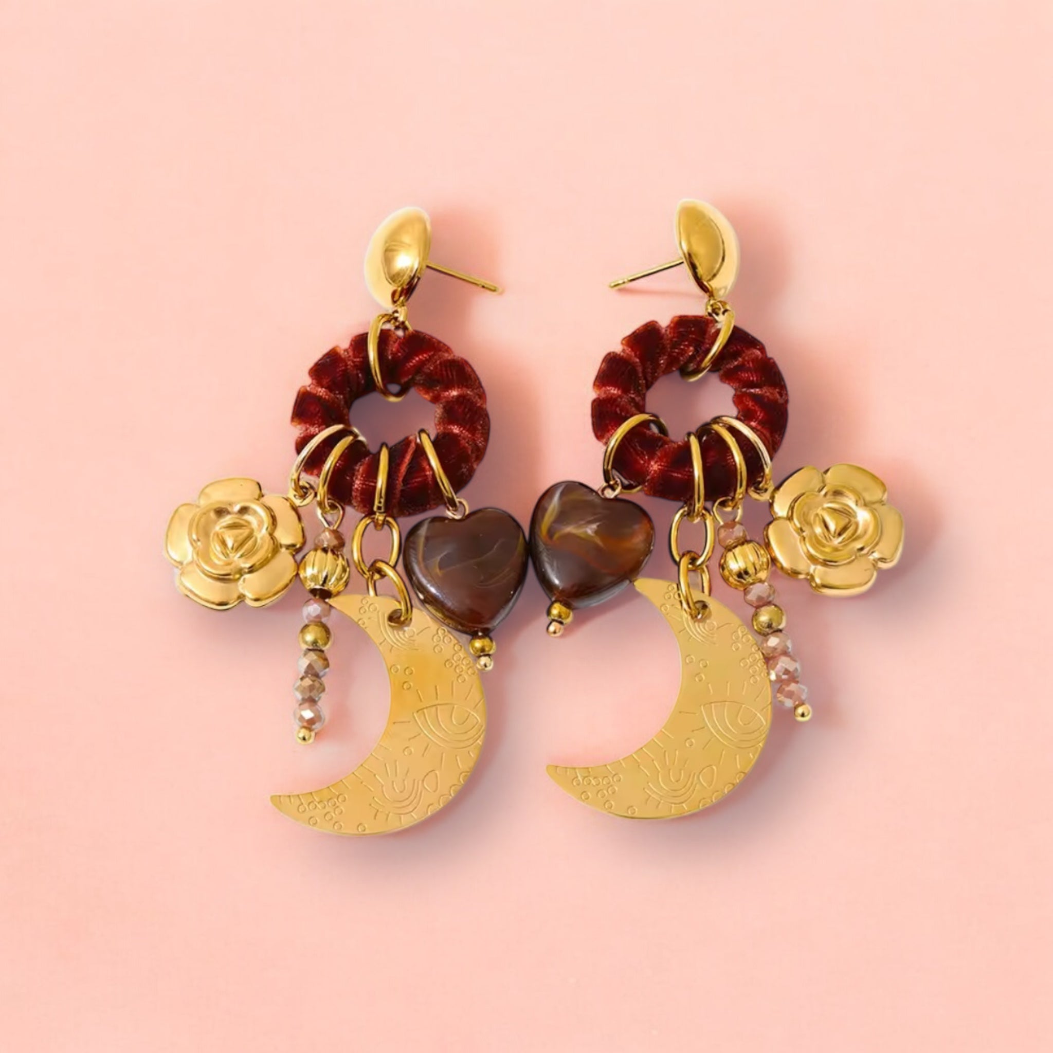 Atrévete con los Pendientes Flor de Luna. El aro está envuelto en suave terciopelo burdeos y decorado...