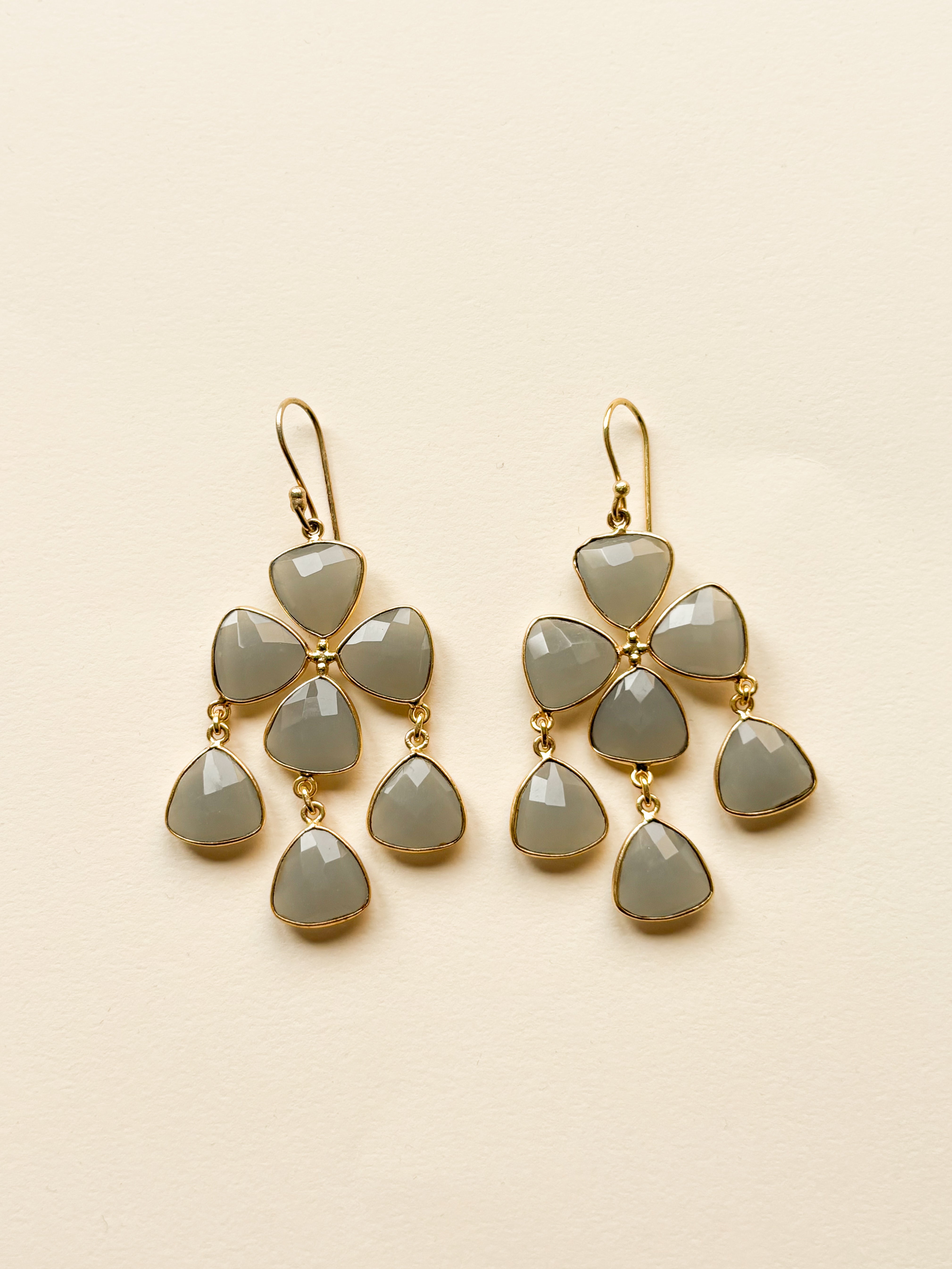 Pendientes largos en tono gris piedra con acabado facetado y baño de oro. Un diseño elegante y...