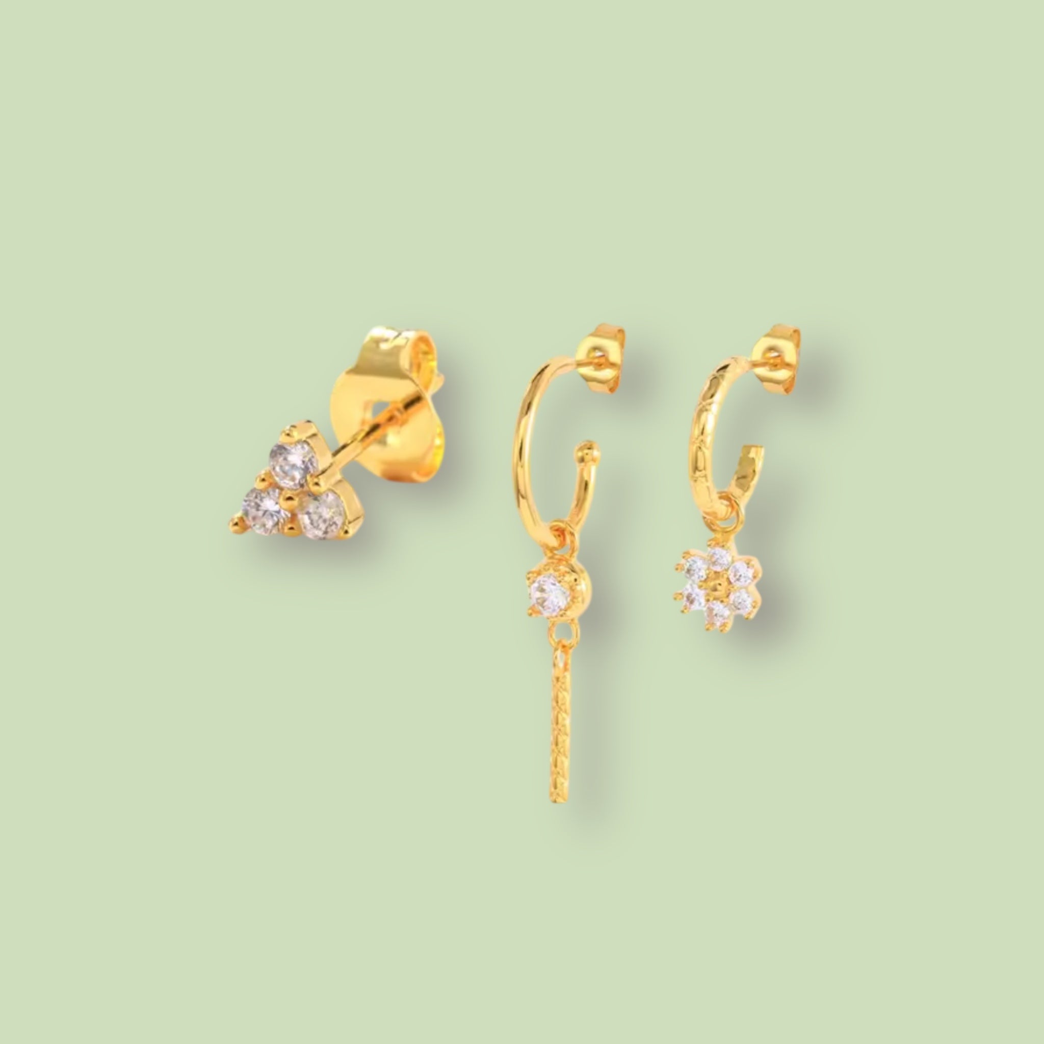 Tres diseños, infinitas combinaciones. El Pack incluye un pendiente tipo botón con tres circonitas, un aro mini con colgante fino texturizado y circonita central, y un aro mini con charm floral de circonitas. Perfecto para llevar juntos en un look de oreja completa o por separado según tu estilo del día. Ligeros, hipoalergénicos y llenos de luz.