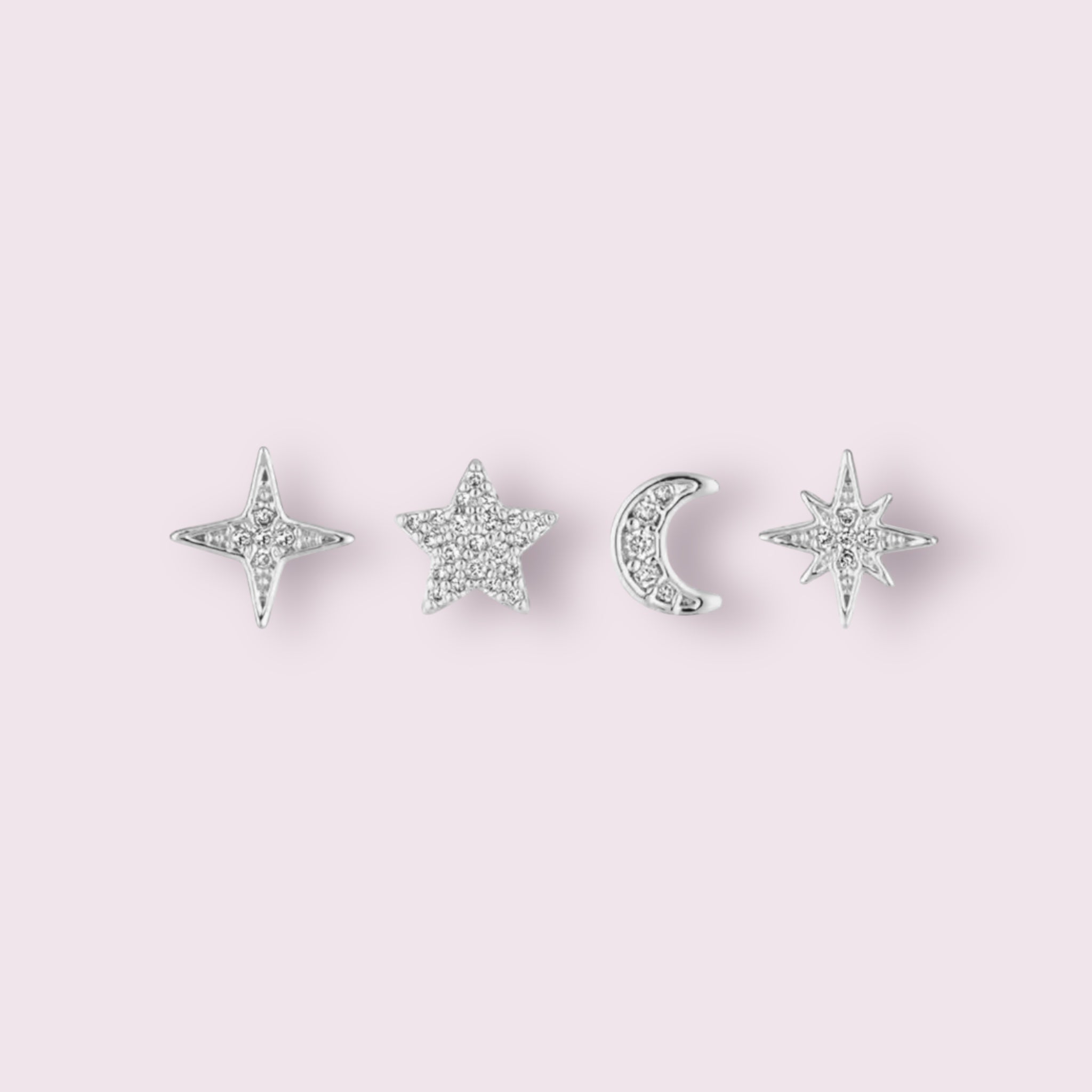 Lleva un trocito de cielo siempre contigo. El Pack incluye cuatro pendientes de botón con forma de estrella, luna y destellos, todos decorados con circonitas brillantes. Perfectos para combinar entre sí o con otras piezas y crear tu propio universo en la oreja. Ligeros, hipoalergénicos y llenos de magia.