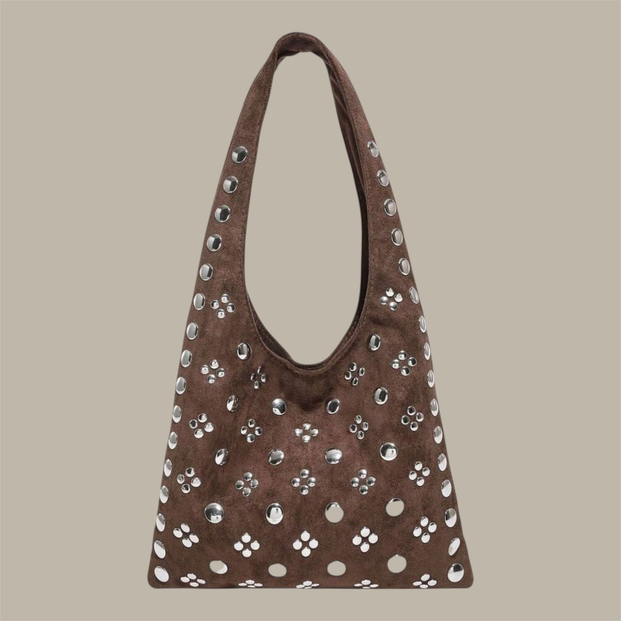 Bolso confeccionado en tejido tipo ante en color marrón, decorado con apliques metálicos redondos en toda la superficie. Diseño con asa ancha integrada de 25 cm de caída, ideal para llevar al hombro. Cierre superior abierto y compartimento único sin divisiones.