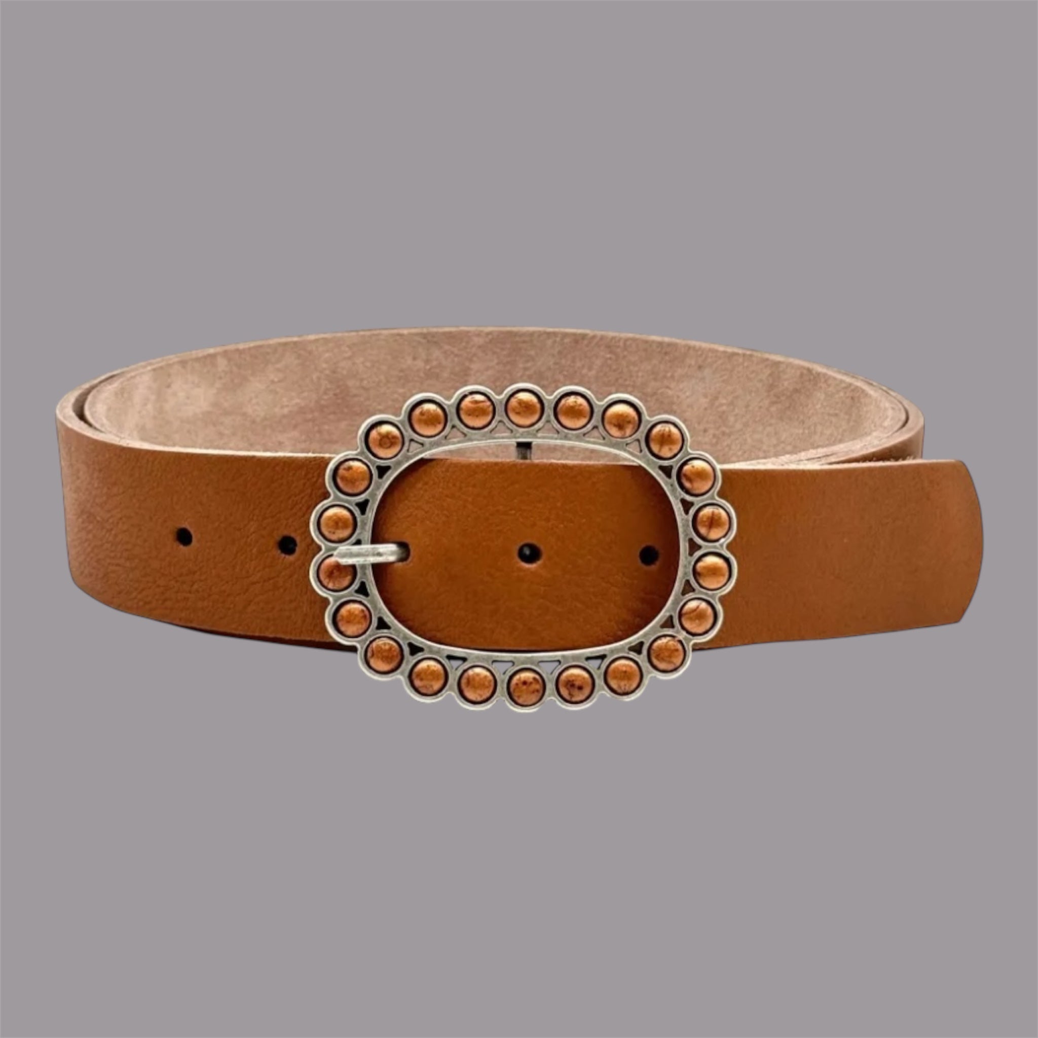 Cinturón de piel auténtica (90–95 cm) con hebilla ovalada adornada con tachuelas metálicas. Disponible en varios tonos,...