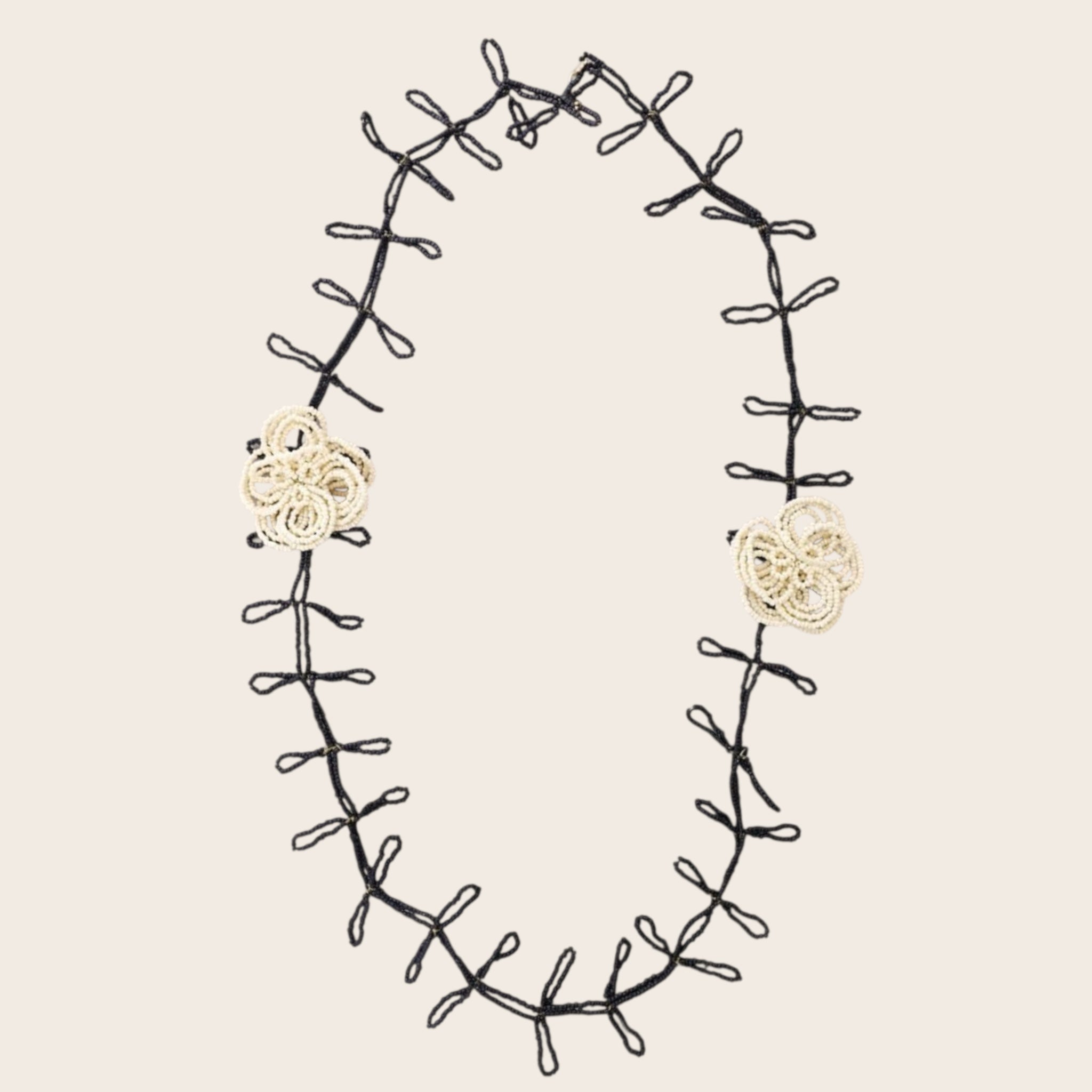 Collar artesanal de hilo en tono negro con pequeñas flores en color marfil, creado con un diseño delicado y lleno de personalidad.