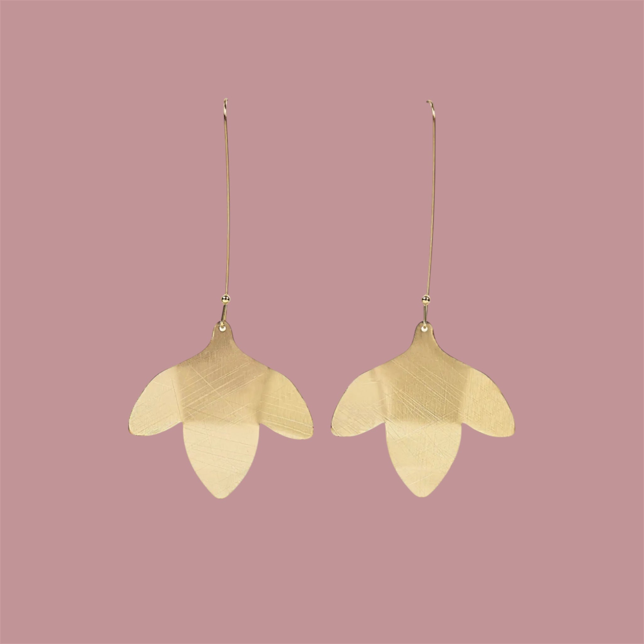 Pendientes largos con colgante en forma de tres pétalos estilizados. Fabricados en acero inoxidable de alta calidad, ofrecen un acabado dorado satinado con textura ligera que refleja la luz con sutileza. Su diseño minimalista y femenino los convierte en un accesorio perfecto para elevar tanto looks casuales como elegantes.