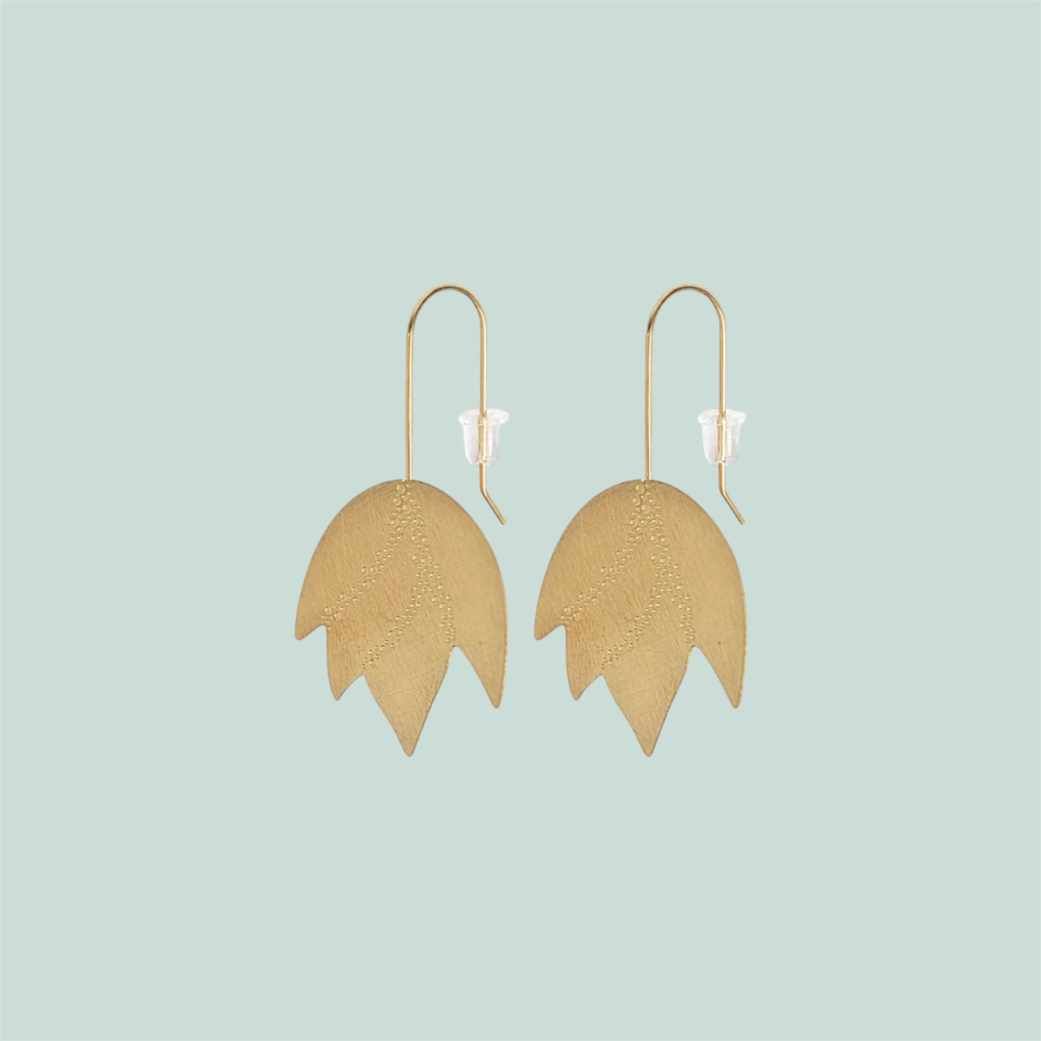 Pendientes largos con colgante en forma de pétalo estilizado, inspirados en la naturaleza. Fabricados en acero inoxidable con acabado dorado mate, destacan por su textura sutil grabada que aporta un aire artesanal y elegante. Su diseño alargado estiliza el rostro y añade movimiento a cualquier look, desde lo casual hasta lo más sofisticado.