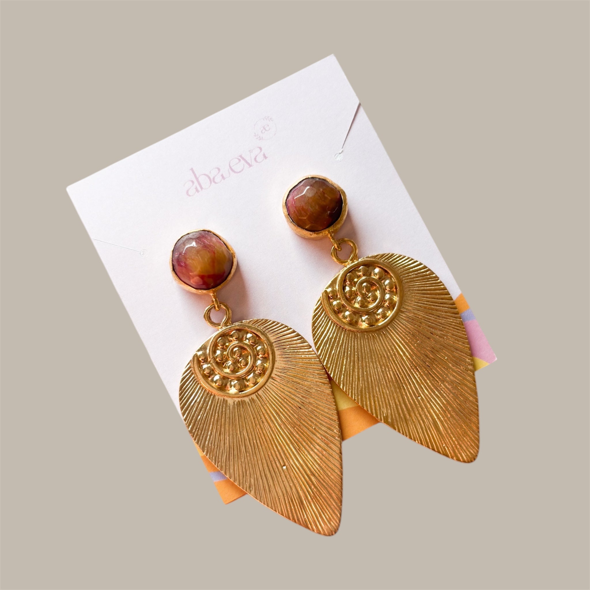 Un diseño lleno de energía y simbolismo. Estos pendientes están formados por una piedra natural facetada en tonos rojizos, que aporta luz y color, y una lágrima dorada bañada en oro 24k con grabado en espiral.