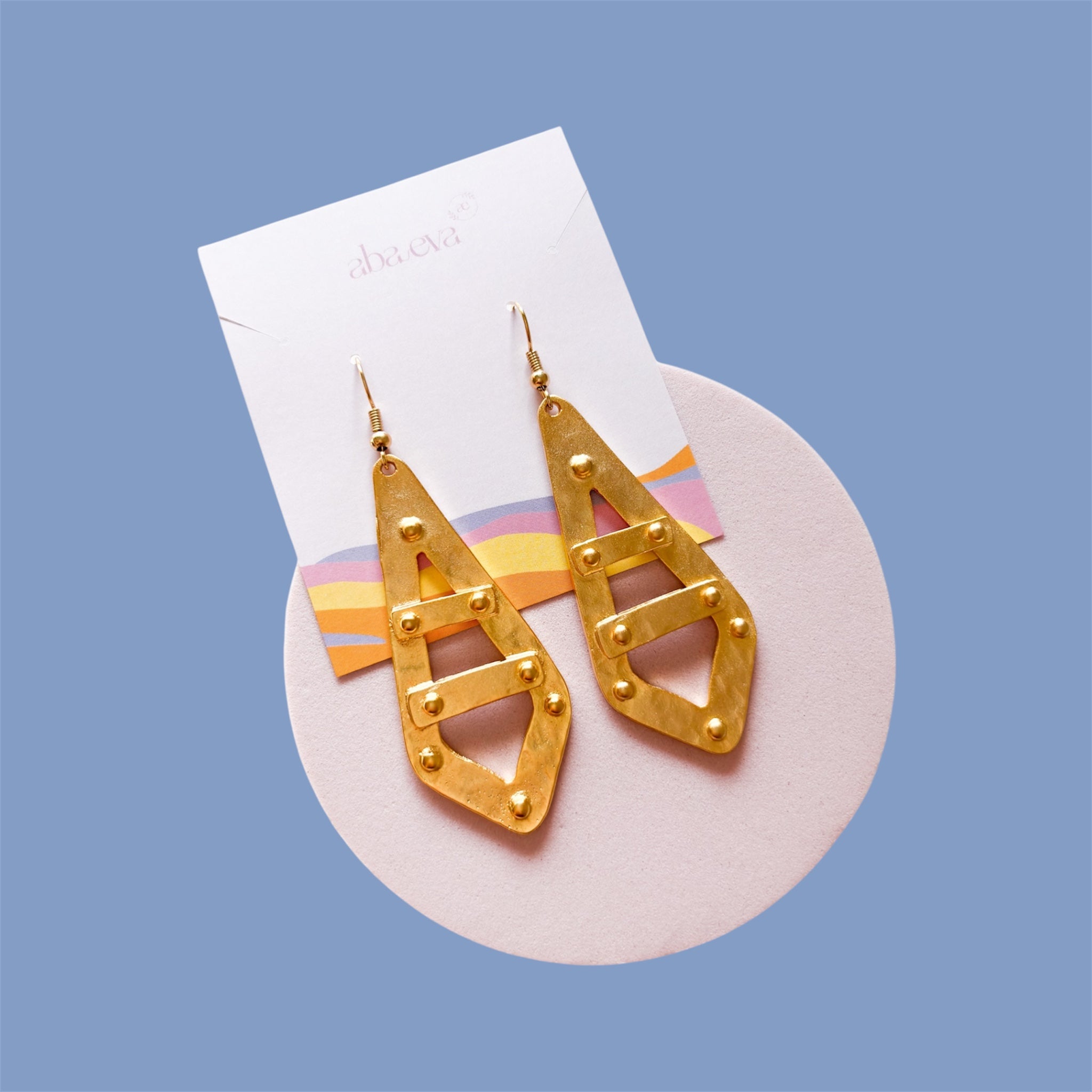 Diseño estructural y atrevido. Estos pendientes largos destacan por sus formas geométricas con aberturas y detalles en relieve, bañados en oro de 24 quilates.
