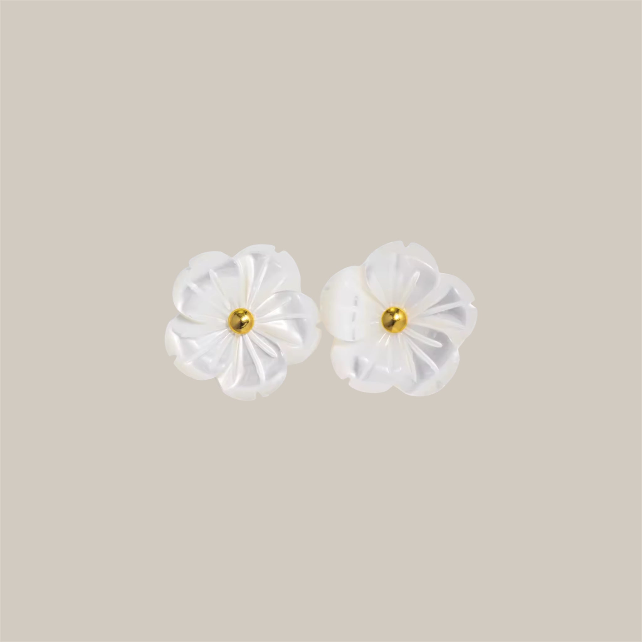 Pendientes pequeños en forma de flor tallada de efecto nácar, con un centro esférico dorado que aporta contraste y luminosidad. Fabricados en acero inoxidable de alta calidad, son hipoalergénicos, resistentes y ligeros. Su diseño delicado y atemporal los convierte en el accesorio ideal para uso diario o para añadir un toque romántico a un look elegante.