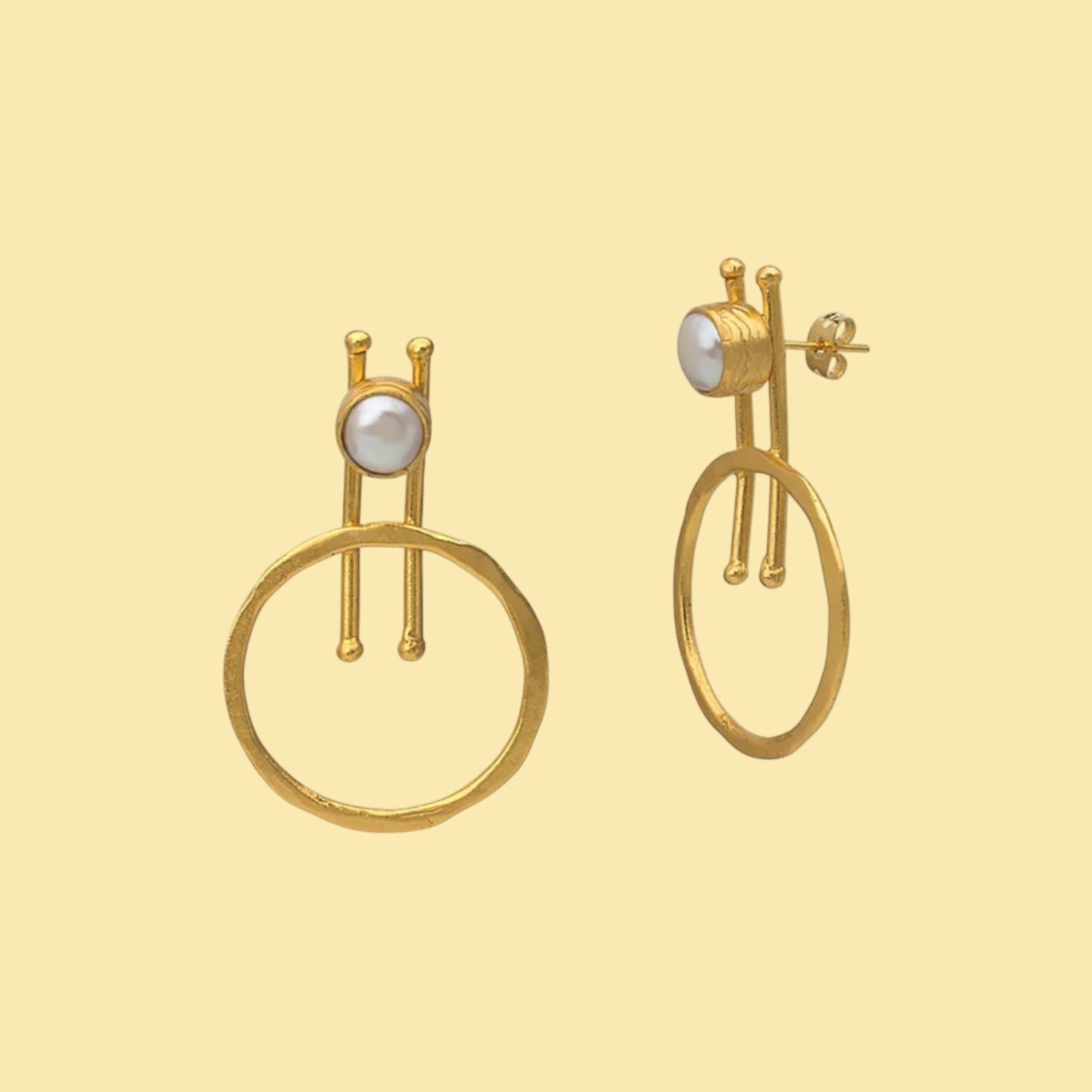 Una joya minimalista con un twist atemporal. Estos pendientes están formados por dos líneas bañadas en oro 18k que enmarcan una perla natural, creando un contraste perfecto entre la pureza nacarada de la perla y el brillo cálido del oro.