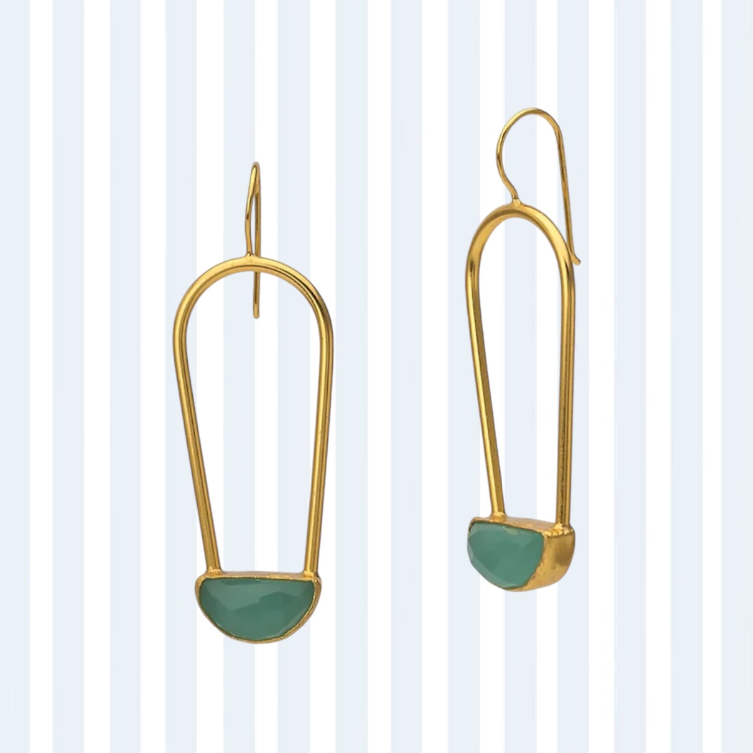 Estos pendientes alargados, bañados en oro 18k, están diseñados para estilizar el rostro y dar un aire elegante y moderno a cualquier look. Su estructura fina y alargada culmina con una piedra de calcedonia blanca, conocida por su luminosidad suave y su capacidad para captar la luz de una forma delicada y especial.