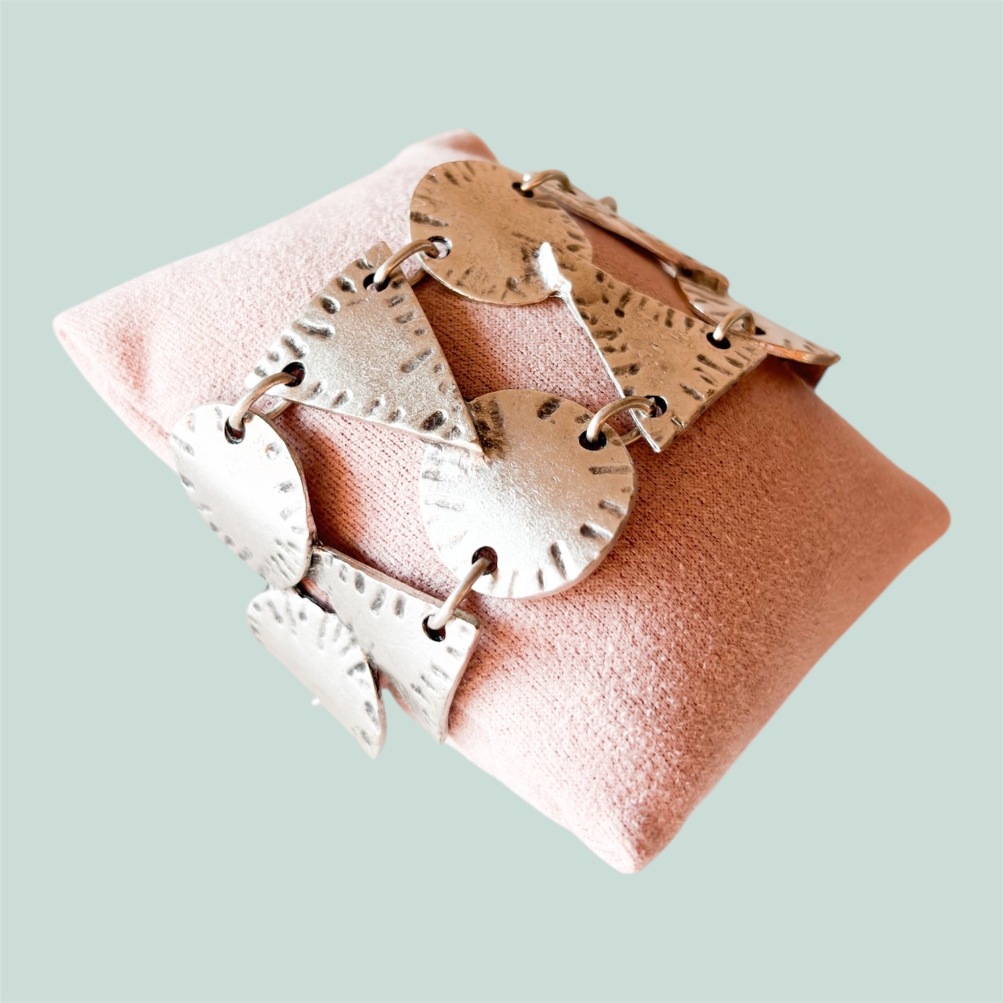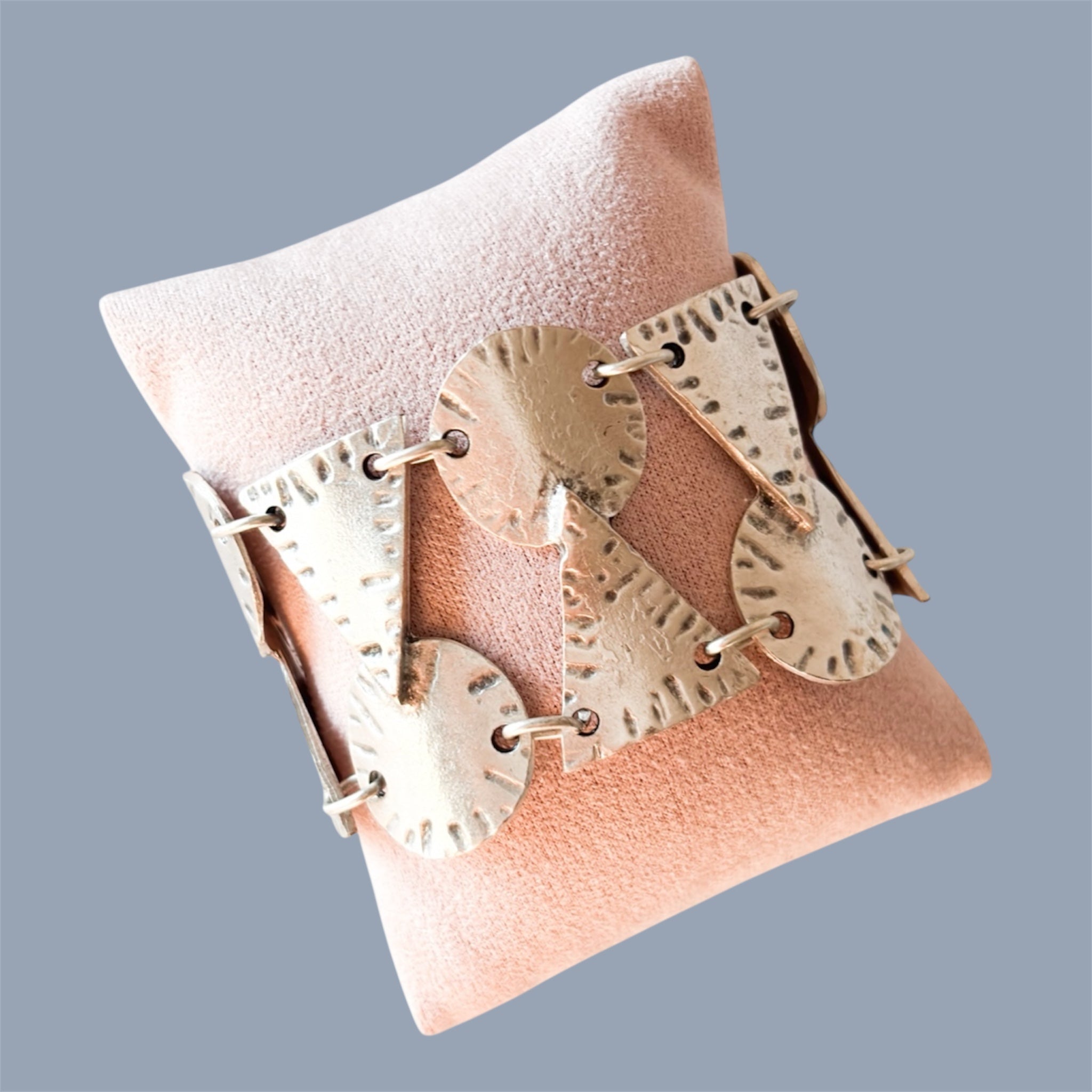 Un diseño con carácter y simbolismo. Esta pulsera está formada por piezas geométricas triangulares y circulares unidas entre sí, con acabado martillado en plata envejecida.