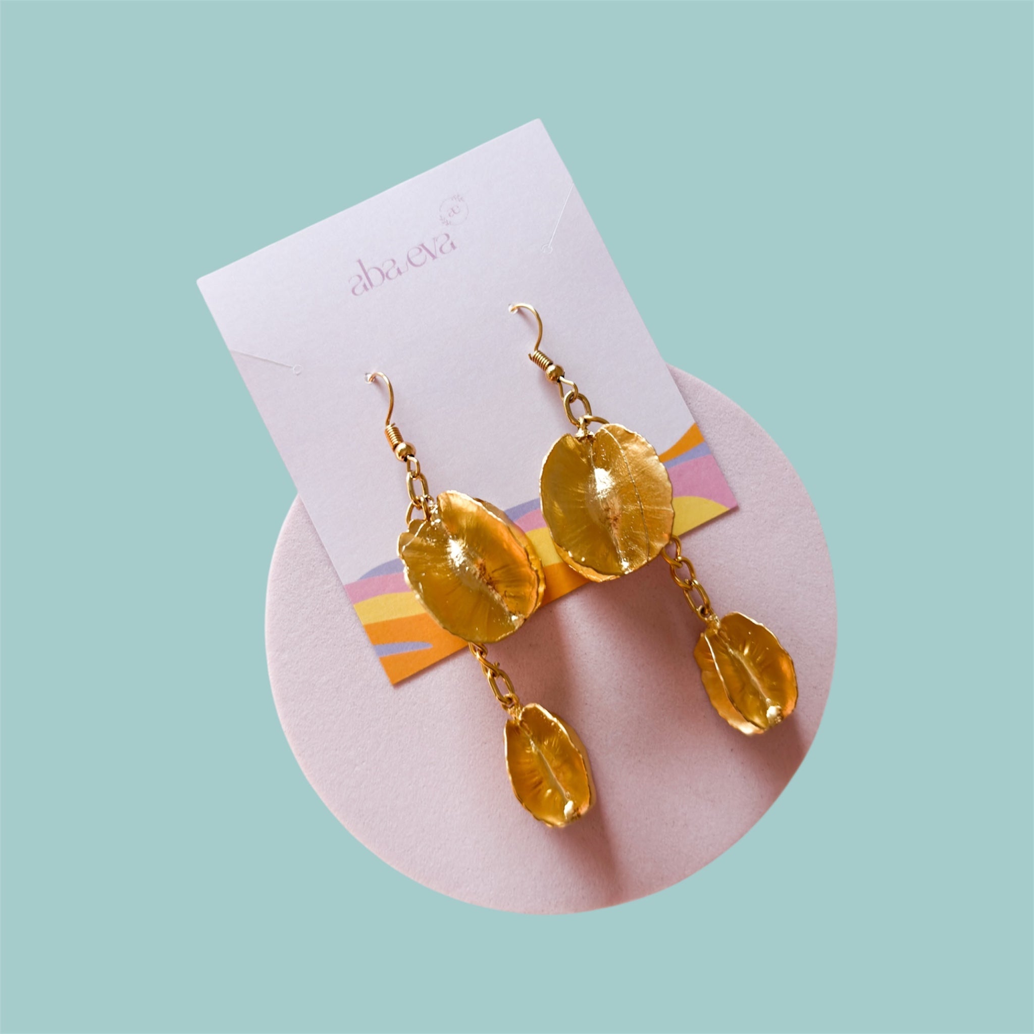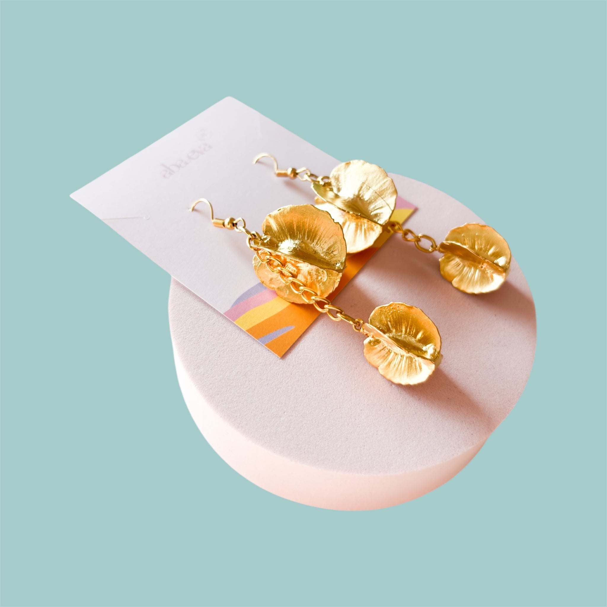 Naturaleza y elegancia en un mismo diseño. Estos pendientes largos están formados por discos irregulares con acabado martillado, unidos en cascada y bañados en oro de 24 quilates.